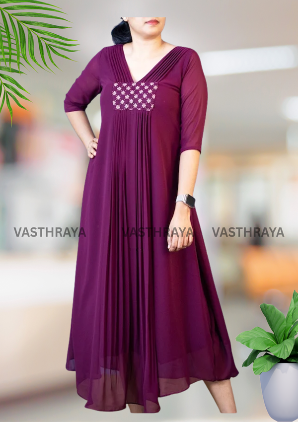 Step into the spotlight with our luxurious Dark Wine Red Designer Party Gown, crafted in rich velvet for an opulent finish. The deep hue exudes sophistication, while the subtle shimmer embroidery on the bodice adds just the right touch of festive sparkle. Designed with a flattering fit-and-flare silhouette, this gown drapes beautifully to enhance your natural grace. Perfect for evening receptions, cocktail parties, and festive celebrations.